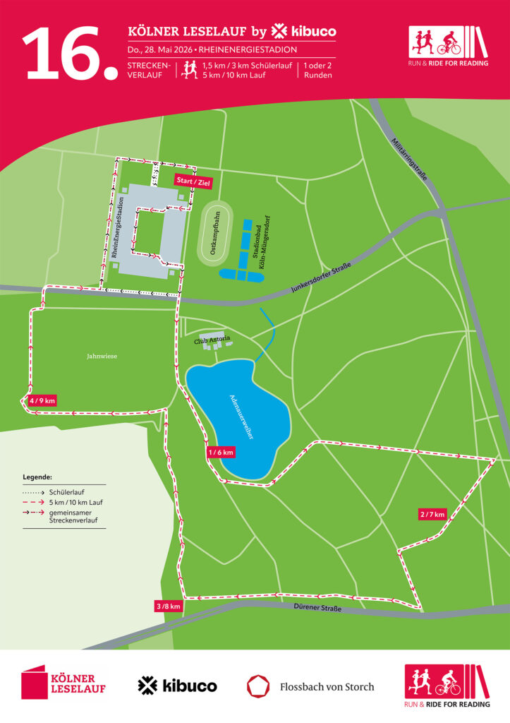 Der Kölner Leselauf hat ein vielseitiges sportliches Programm zu bieten: Laufen, Radfahren, Powerwalking und Yoga - all das ist bei uns möglich. Die gemeinnützige Veranstaltung richtet sich primär an Firmenteams, aber auch Einzelstarter:innen sind herzlich willkommen. Ebenfalls in die Veranstaltung integriert ist der Lauf der Kölner Schulen, bei dem der Spaß und die Förderung des sozialen und gemeinschaftlichen Erlebens im Vordergrund stehen.